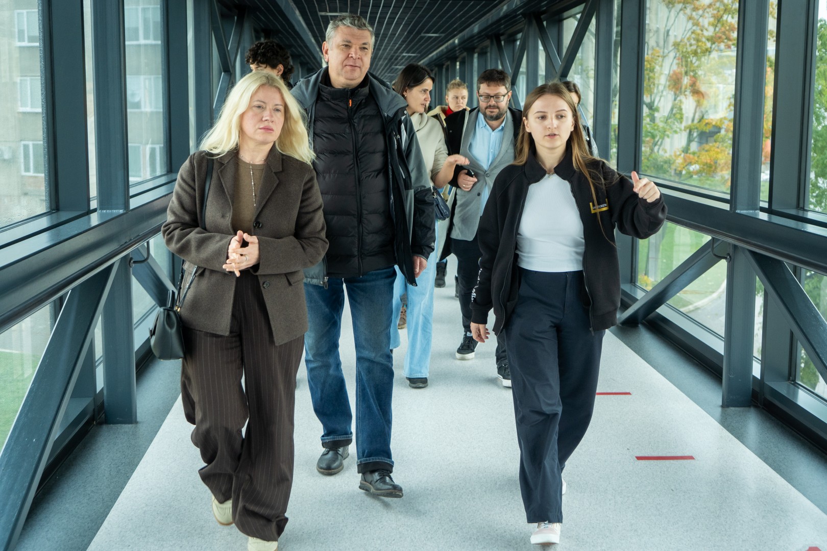 Екскурсія починається з одного із реконструйованих корпусів закладу. Верхні поверхи зведені з використанням CLT-технології. Cross-Laminated Timber – перехресно-клеєна деревина – це панелі з кількох шарів дощок, склеєних перпендикулярно під кутом 90 градусів одна до одної. Технологія дозволяє надбудовувати та реконструювати наявні будівлі без значного навантаження на фундамент.
