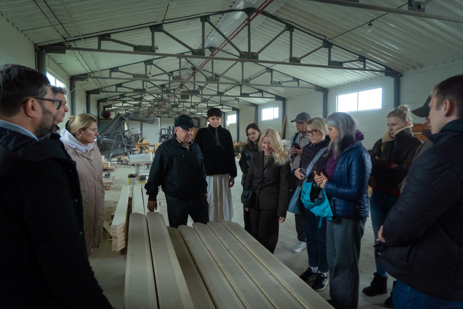 Володимир Храпко, власник підприємства, зустрічає групу біля виробничих цехів. Один із них побудовано лише пів року тому. Підприємство виробляє дерев’яні драбини, що дуже популярні у Європі, та розширює виробництво на вікна й двері.