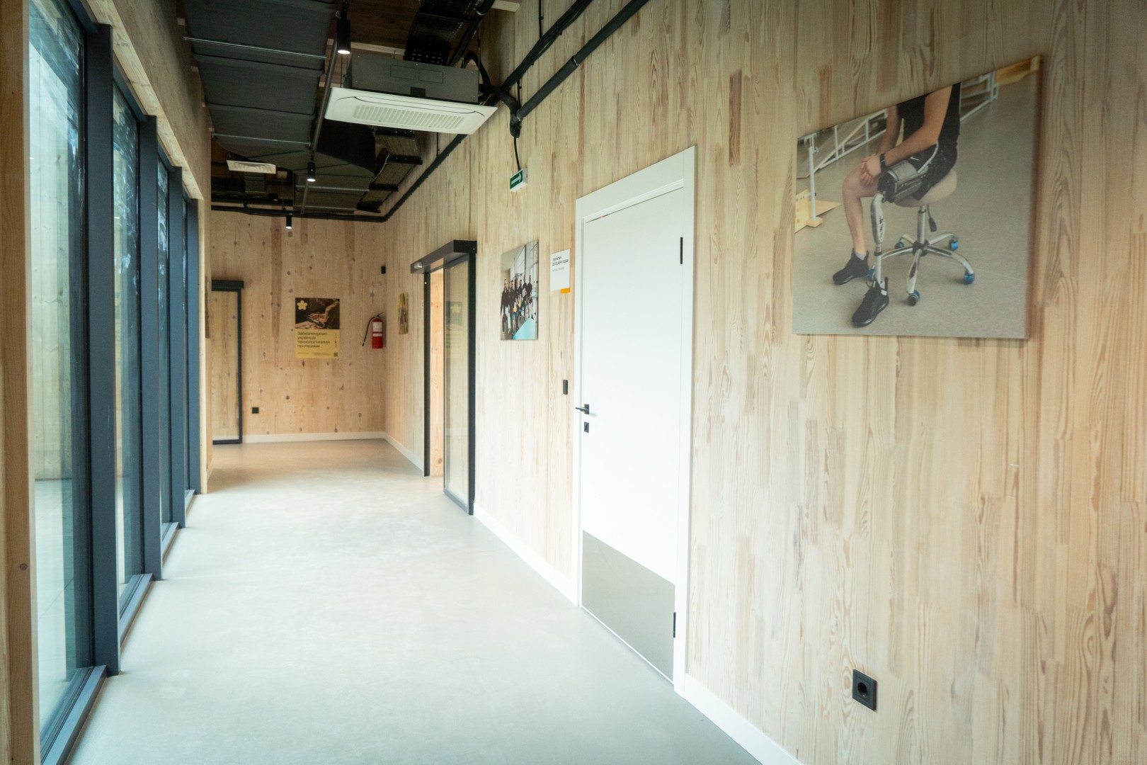 Екскурсія починається з одного із реконструйованих корпусів закладу. Верхні поверхи зведені з використанням CLT-технології. Cross-Laminated Timber – перехресно-клеєна деревина – це панелі з кількох шарів дощок, склеєних перпендикулярно під кутом 90 градусів одна до одної. Технологія дозволяє надбудовувати та реконструювати наявні будівлі без значного навантаження на фундамент.